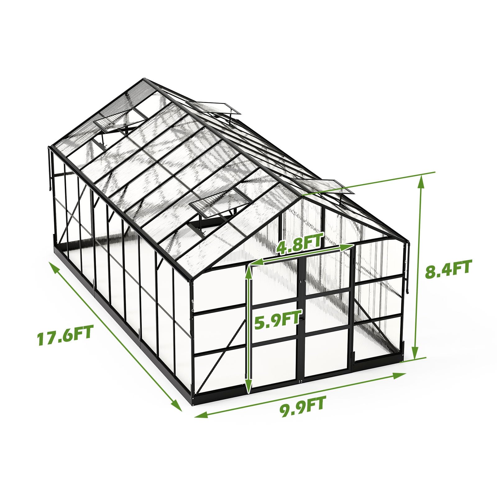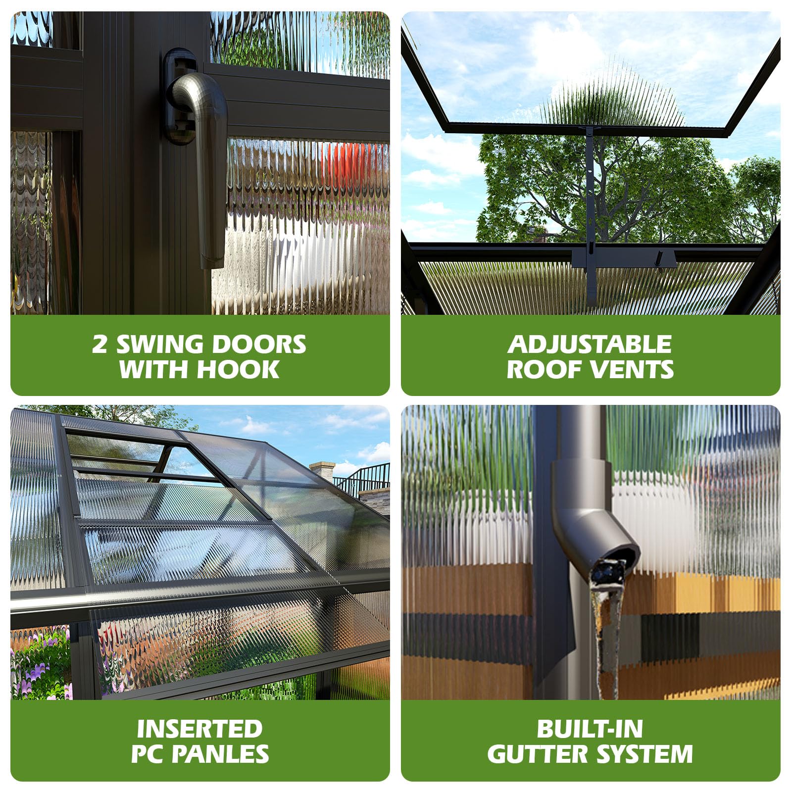 AMERLIFE Polycarbonate Greenhouse with 4 Roof Vents & Rain Gutter
