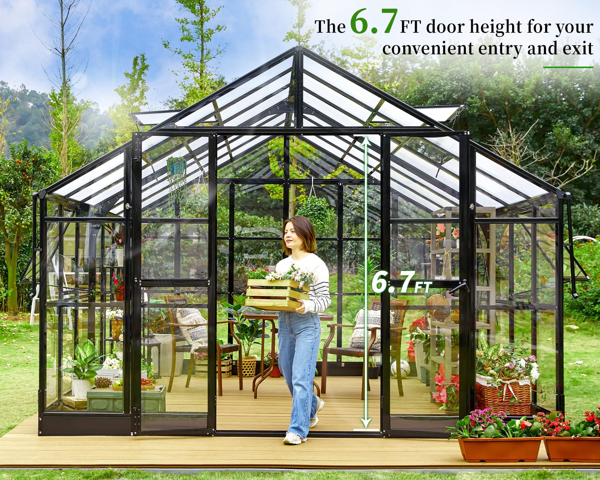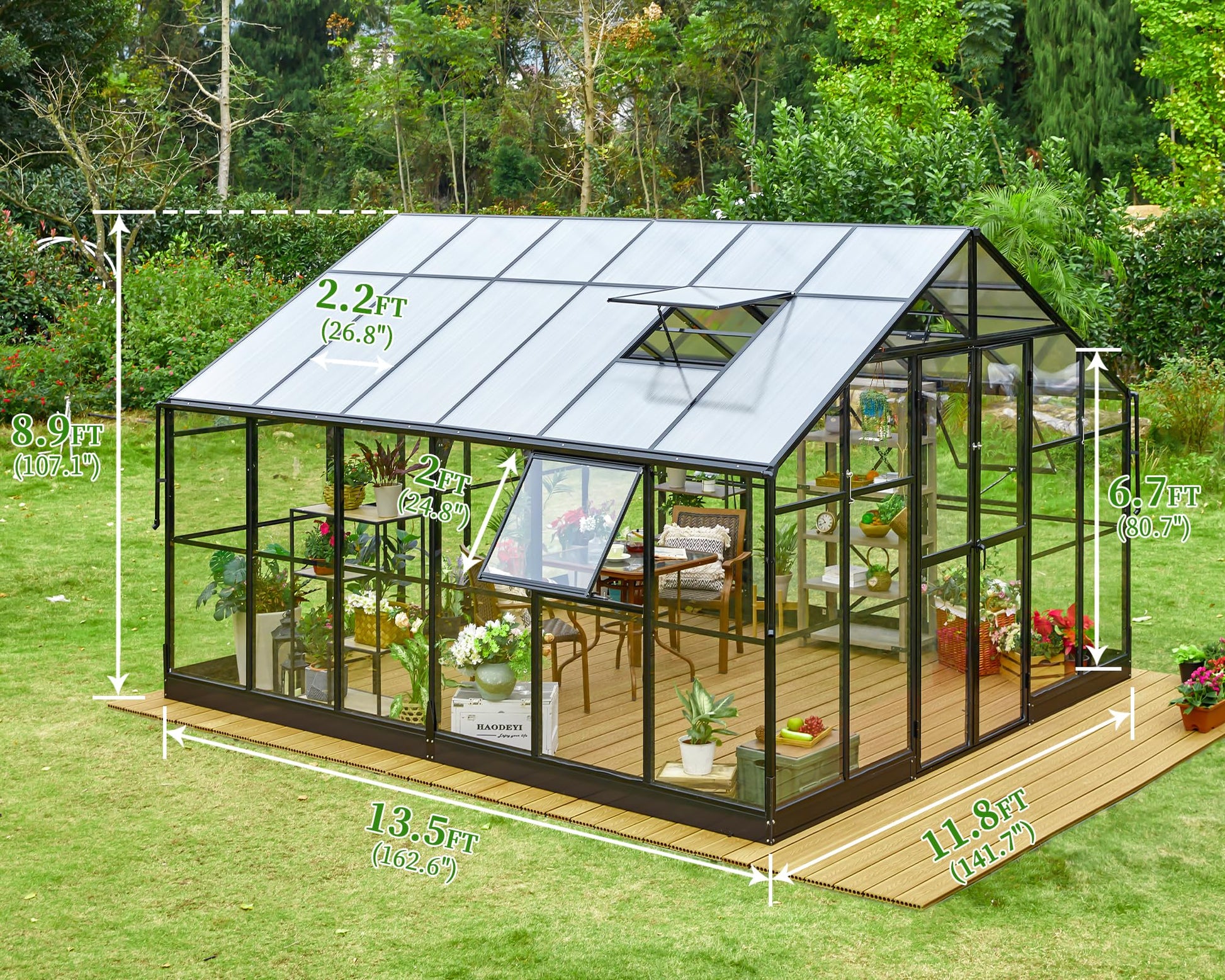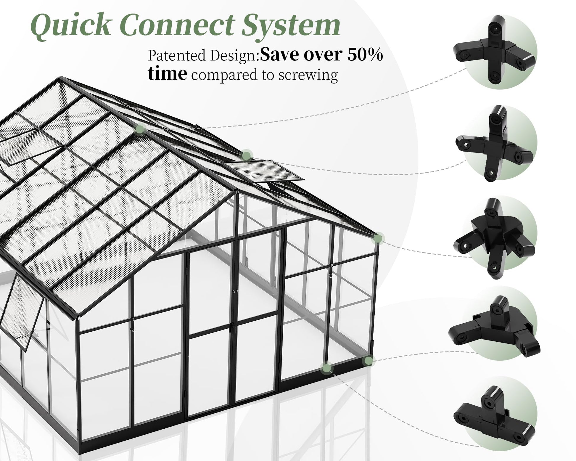 Revolutionary Quick-Connect Greenhouse – Assembles in 5 Hours! The Jocisland 12x13.5 FT Polycarbonate Greenhouse combines patented Quick Connect fittings with a heavy-duty aluminum frame for the fastest, sturdiest setup on the market. Featuring 6mm hybrid PC panels (99.99% UV blocking), 4 ventilation windows, and 6.7’ double doors, this greenhouse delivers professional-grade performance for serious gardeners.