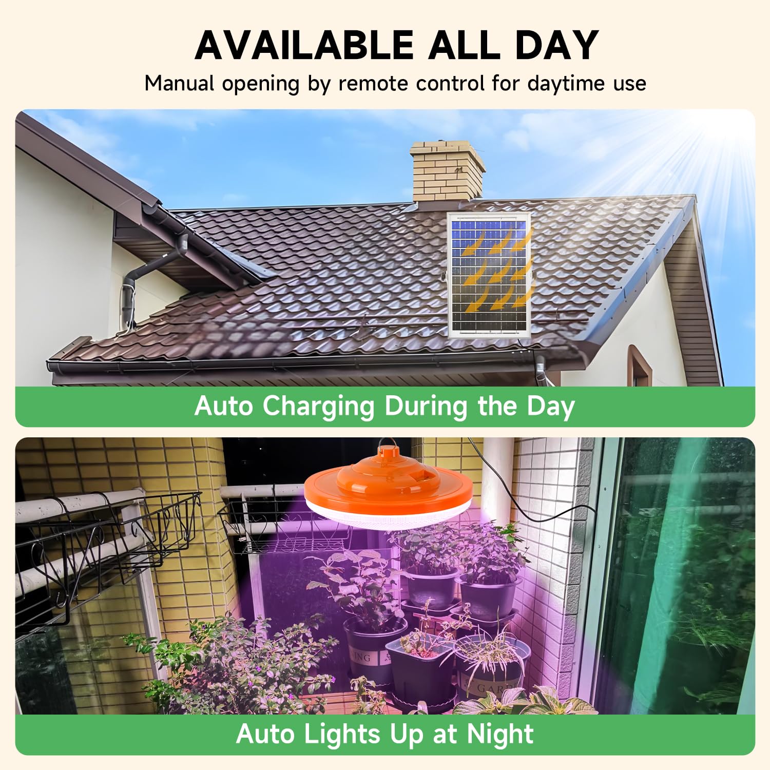 - 【Solar Powered & 0 Electricity Bill】This solar plant grow light automatically lights up at night and turns off during the day when connected to a solar panel. Solar grow lights for indoor plants can be used as supplemental light for plants to promote growth and there's no need to pay any electricity bill for it! NOTE: manual opening by remote control/button on the bulb for daytime use.